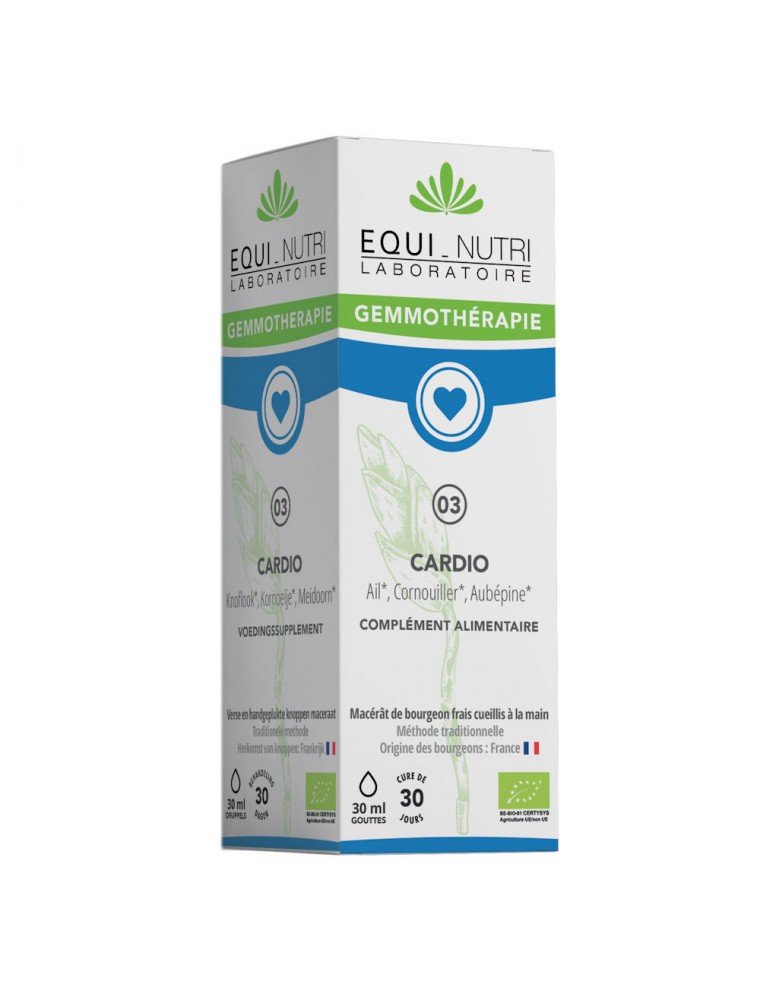 Cardio n°3 Bio du laboratoire Equi-Nutri est traditionnellement utilisé pour soutenir la santé cardio-vasculaire. En gemmothérapie, les bourgeons d’aubépine et de cornouiller contribuent à normaliser le rythme cardiaque et à maintenir une tension artérielle équilibrée, favorisant ainsi un fonctionnement cardiovasculaire optimal.