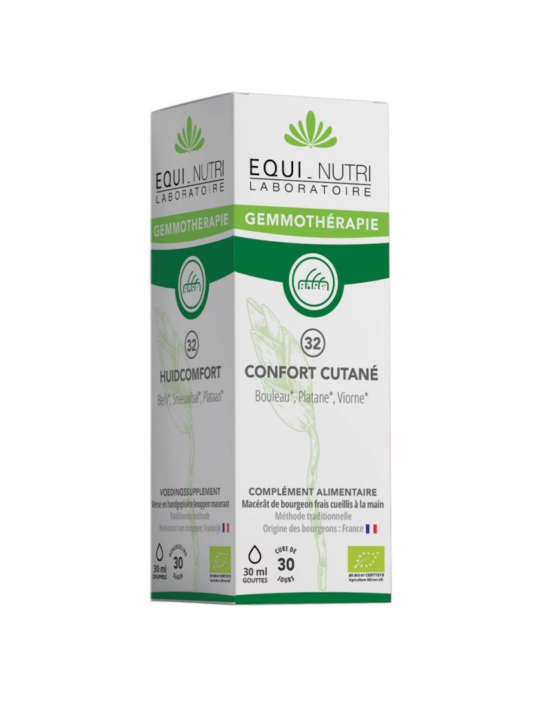 Confort Cutané n°32 Bio du laboratoire Equi-Nutri est traditionnellement utilisé pour soulager les troubles aigus et chroniques de la peau. En gemmothérapie, les bourgeons de Bouleau, Platane et Viorne contribuent à :