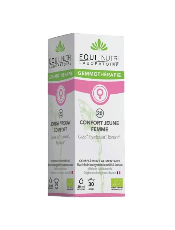 Confort Jeune Femme n°20 Bio du laboratoire Equi-Nutri est traditionnellement utilisé pour soutenir le cycle féminin et favoriser l’équilibre hormonal chez la jeune femme. En gemmothérapie, les bourgeons de Cassis, Framboisier et Romarin contribuent à :
